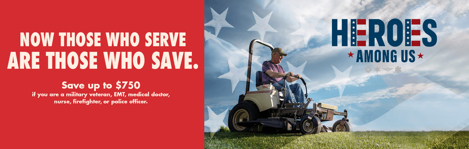 Pricing subject to change without notice. Heroes Among Us offer available for current and former military, EMT, Medical Doctors & Nurses, Firefighters and Police Officers on the purchase of new Grasshopper tractor and deck. Valid identification of active or former service required. Contact your local dealer for full details. Financing offers with approved credit to qualified buyers. Visit GrasshopperMower.com/financing or contact your local Grasshopper dealer for full details.